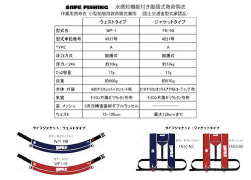 ・着用方法 | ライフジャケットを身体のサイズに合ったものを選び正しくセットし、しっかりと締め付けて下さい。またライフジャケットは衣服の一番上に着用して下さい。詳しい着用方法は取扱説明書にてご確認ください。 |