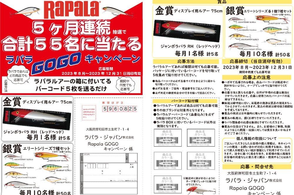 キャンペーンチラシについているハガキにルアーパッケージのバーコードを切り取って、5枚集めて貼りつけてご応募ください。お客様ご自身で官製ハガキに添付、または封筒に同封してご応募していただいても構いません。