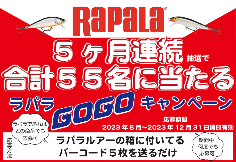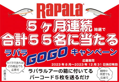キャンペーンチラシについているハガキにルアーパッケージのバーコードを切り取って、5枚集めて貼りつけてご応募ください。お客様ご自身で官製ハガキに添付、または封筒に同封してご応募していただいても構いません。