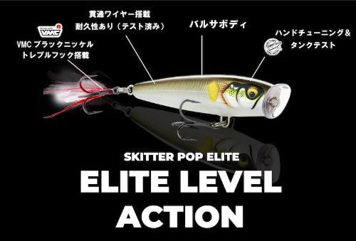 バルサならではのナチュラルな着水音で、ロッドアクションに対しても素直な動きをするスキッターポップ。ポップサウンドやプラスチックのカップから出るスプラッシュで魚を誘い、ドッグウォークアクションが可能になったスキッターポップエリート。速めのピッチからスローにドッグウォークさせ、より幅広く魚を誘うことができる。
