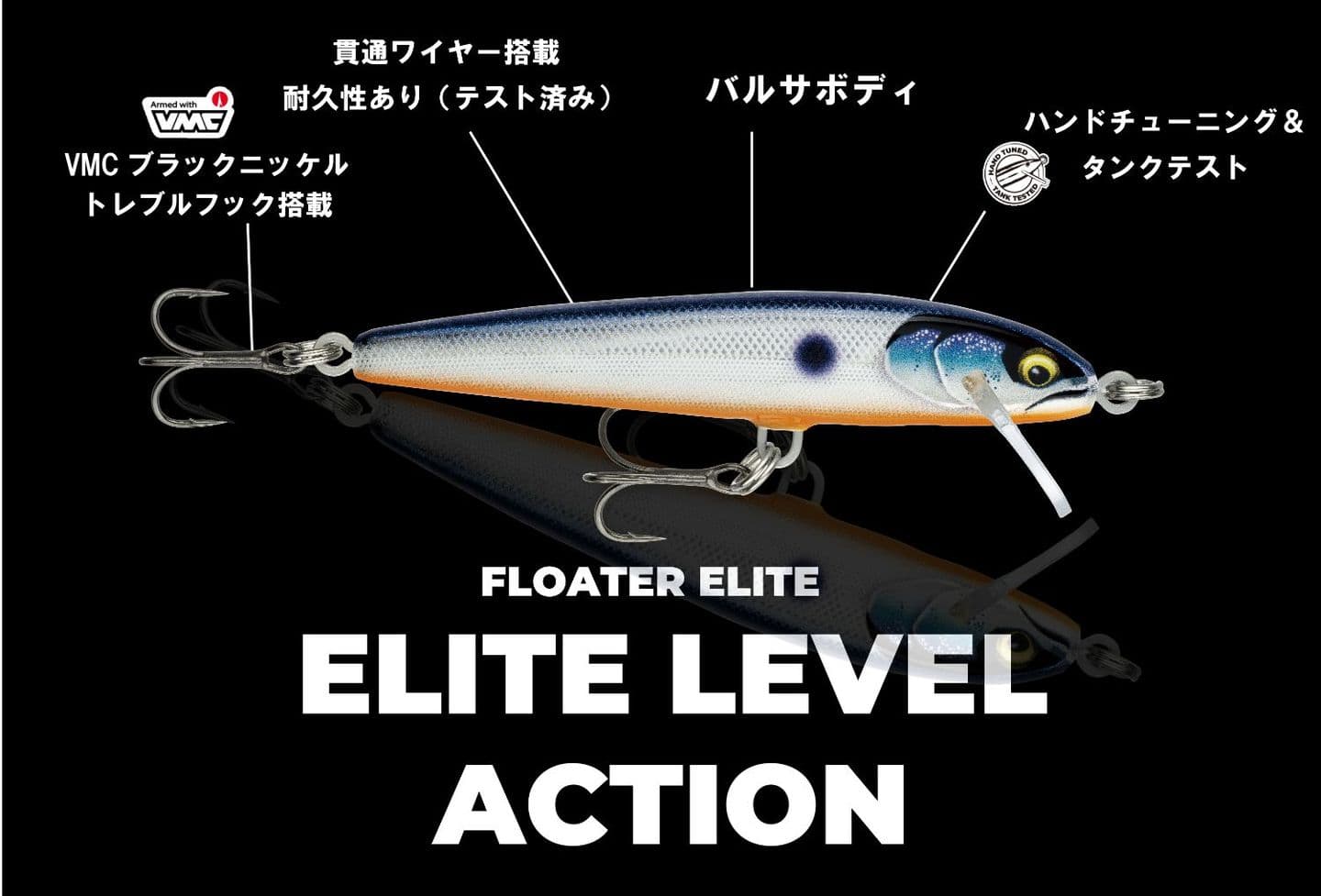 フローターエリートは従来のオリジナルフローターよりもフラットサイドボディで、水の抵抗を回避し、流れの速い場所や連続トゥイッチでも姿勢を崩しにくい。