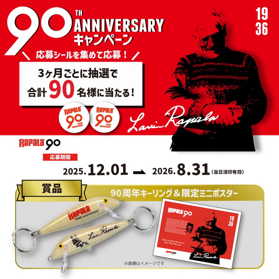 90周年記念ルアーキットのパッケージに付いている応募シール2枚をハガキに貼り付け、必要事項を明記の上、ご応募ください。おひとり様何度でもご応募可能です。必ず所定の郵便料金分の切手を貼って投函ください。